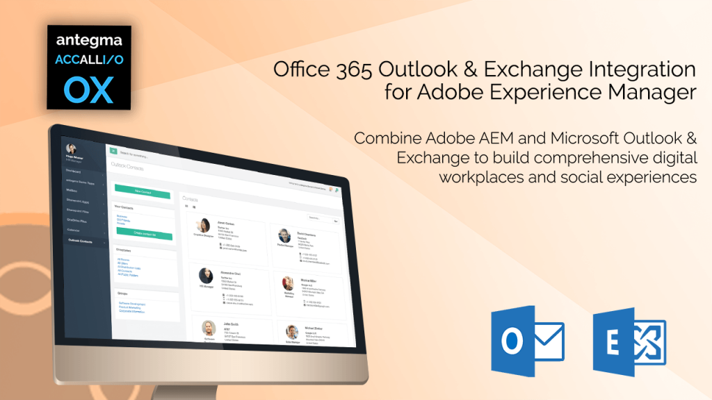 accallio is our continuously growing platform of product integrations for Adobe Experience Manager. Build a comprehensive platform with a numerous list of accallio product integrations to make your Adobe Experience Manager an “access all I/O” solution. accallio OX integrates Microsoft Office 365 Outlook & Exchange in your Adobe Experience Manager. Emails are part of everyone’s daily life. Wouldn’t it be great to access all emails in the same tool you are consuming all your corporate content with? With accallio OX there is no need to switching windows or even tools to consume your corporate content and emails.