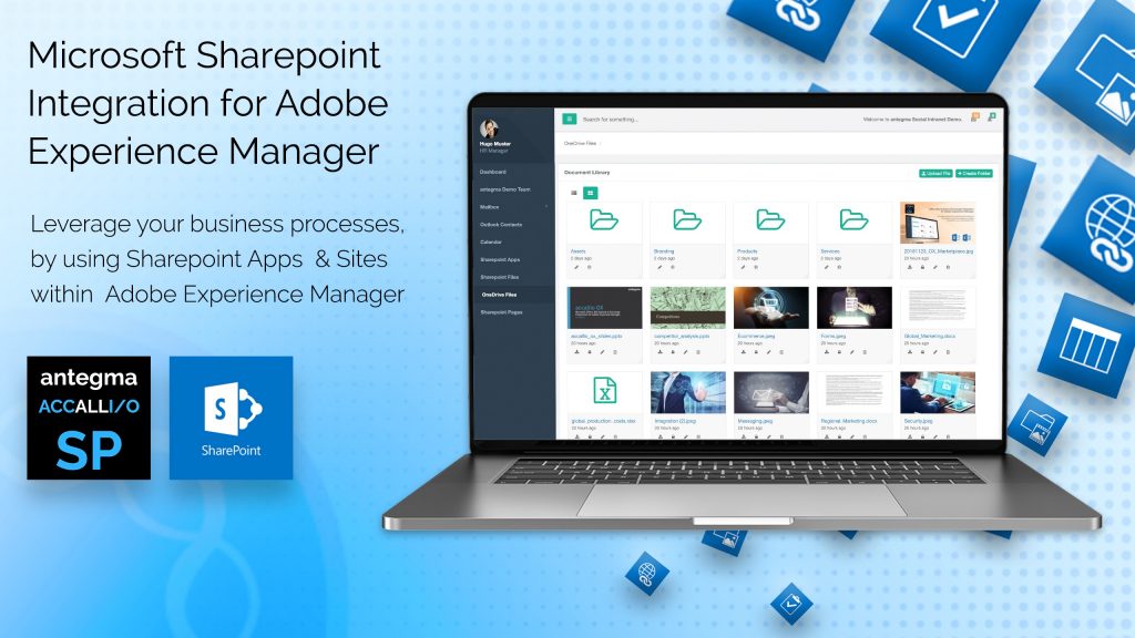 accallio SP integrates Microsoft SharePoint within Adobe Experience Manager. You will have access to selected SharePoint features and applications inside Adobe Experience Manager. Benefit from individually created sites, which can be adjusted to the user’s needs in Microsoft SharePoint and rendered inside the Adobe Experience Manager solution. Enriched your Adobe Experience Manager sites with social features of Microsoft SharePoint like wikis, discussions and calendars. Easily access, store, version control your documents in SharePoint using Adobe Experience Manager. Use Office 365 file formats in the business logic of your content management solution and convert them into other formats by using Excel, Word and PowerPoint Services of SharePoint.