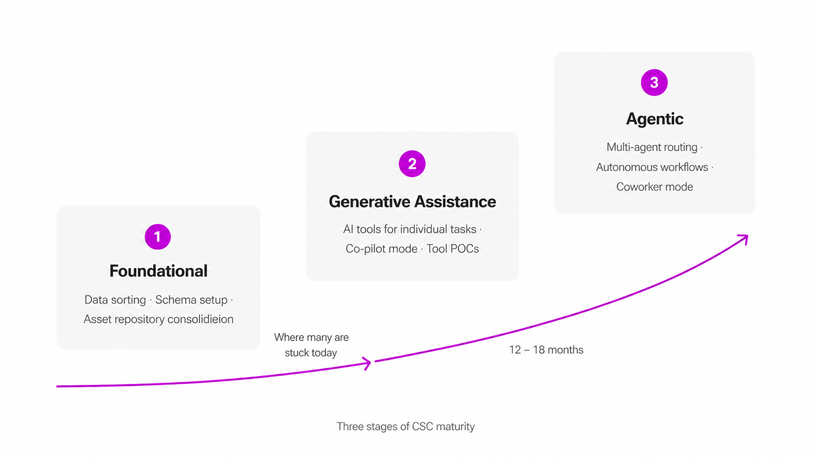 Three stages: Foundational (data sorting, schema setup, asset repository consolidation), Generative Assistance (AI tools for individual tasks, co-pilot mode, tool POCs), and Agentic (multi-agent routing, autonomous workflows, coworker mode). Most brands sit between stages 1 and 2; the jump to stage 3 typically takes 12 to 18 months.